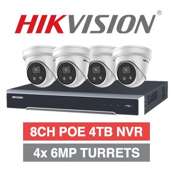 - HIKVISION, 8 channel HD-IP 6MP turret kit, Includes 1x DS-7608NI-M2-8P-4T 8ch POE NVR w/ 4TB HDD & 4x DS-2CD2366G2H-IU-2.8 6MP IP IR turret cameras w/ 2.8mm fixed lens