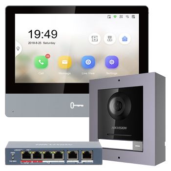 - HIKVISION, IP Intercom Kit, Includes 1 x DS-KD8003-IME1 door station module, 1x DS-KD-ACW1 surface mount backbox/frame & 1x DS-3E1106HP-EI POE switch