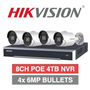 - HIKVISION, 8 channel HD-IP 6MP bullet kit, Includes 1x DS-7608NI-M2-8P-4T 8ch POE NVR w/ 4TB HDD & 4x DS-2CD2066G2H-IU 6MP IP IR bullet cameras w/ 2.8mm fixed lens