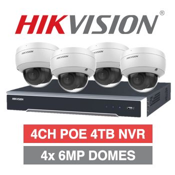- HIKVISION, 4 channel HD-IP 6MP dome kit, Includes 1x DS-7604NI-M1/4P 4ch POE NVR w/ 4TB HDD & 4x DS-2CD2166G2-I-2.8 6MP IP IR dome cameras w/ 2.8mm fixed lens