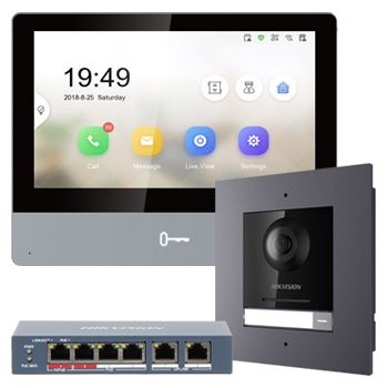 - HIKVISION, IP Intercom Kit, Includes 1 x DS-KH8350-WTE1 7" room station, 1 x DS-KD8003-IME1/FLUSH door station & 1 x DS-3E1106HP-EI POE switch
