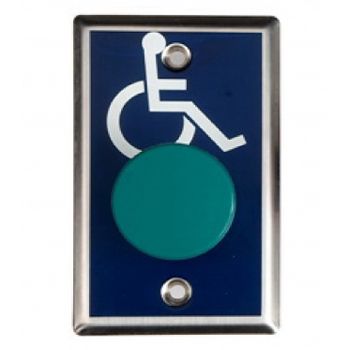 - NETDIGITAL, Switch plate, Wall, Wheelchair image on plate, Stainless steel, With green mushroom head push button, N/O and N/C contacts