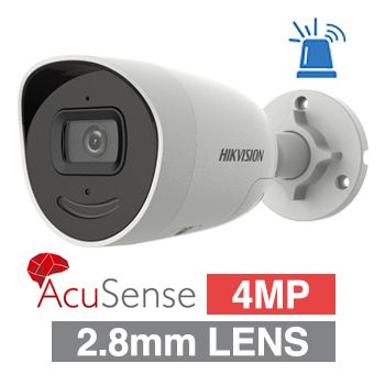 - HIKVISION, 4MP AcuSense G2 HD-IP outdoor Mini Bullet camera w/ 2-way audio, strobe & audible alarm (LiveGuard), White, 2.8mm fixed lens, 40m IR, WDR, Microphone, IP67, 12V DC/POE