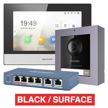 - HIKVISION, IP Intercom Kit, Includes 1 x DS-KH6320-WTE1/BLACK 7" room station, 1 x DS-KD8003-IME1 door station module, 1x DS-KD-ACW1 surface mount backbox/frame & 1x DS-3E1106HP-EI POE switch
