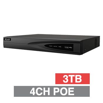 - HILOOK, HD-IP PoE NVR, 4 channel POE (802.3af/at), 40Mbps bandwidth, 1x 3TB SATA HDD (up to 1x 6TB), 4K, VMD, USB/Network backup, Ethernet, 2x USB2.0, 1 Audio In/Out, HDMI/VGA (independent)