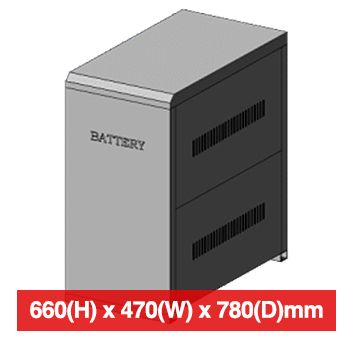 - PSS, Battery bank for PSS Enduro UPS, 2 shelves holds up to 60 x 9Ah batteries, 780mm x 470mm x 660mm (DxWxH), must be quoted by PSS for batteries/run time.