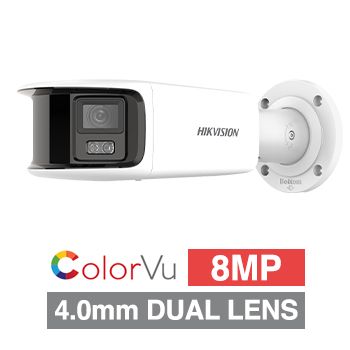 - HIKVISION, 8MP ColorVu G2 HD-IP outdoor Panoramic Bullet camera w/ 2-way audio, strobe & audible alarm (LiveGuard), White, 4.0mm fixed lens, 40m White LED, WDR, Microphone, I/O (Alarm & Audio), IP67