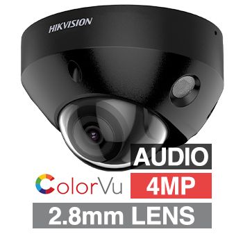 - HIKVISION, 4MP ColorVu G2 HD-IP outdoor Vandal Mini Dome camera w/ audio, Black, 2.8mm fixed lens, 30m IR, WDR, Microphone, I/O (Alarm & Audio), 1/1.8" CMOS, H.265+, IP67, IK08, Tri-axis, 12V DC/POE