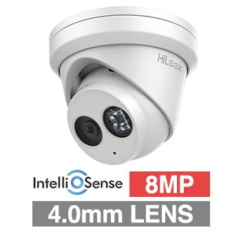 - HILOOK, IntelliSense 8MP HD-IP Outdoor Turret camera, Metal, White, 4.0mm fixed lens, 30m IR, 120dB WDR, Day/Night (ICR), 1/2.8" CMOS, H.265/H.265+, IP67, Tri-axis, Microphone, 12V DC/PoE