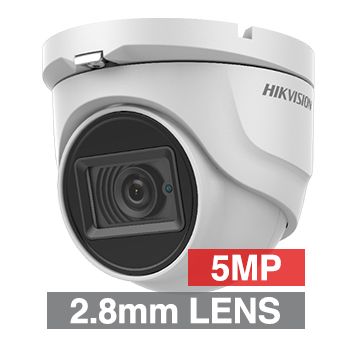 - HIKVISION, 5MP Analogue HD outdoor Turret camera, White, 2.8mm fixed lens, TVI/AHD/CVI/CVBS, 30m IR, 130dB WDR, Day/Night (ICR), IP67, Tri-axis, 12V DC