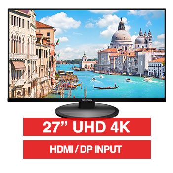 - HIKVISION, 27" LED 16:9 Colour Monitor (Black), 4K 3840 x 2160 resolution, 14ms response, 1000:1 contrast ratio, HDMI/DP input, 100x100 VESA mount, Incl. Desk stand