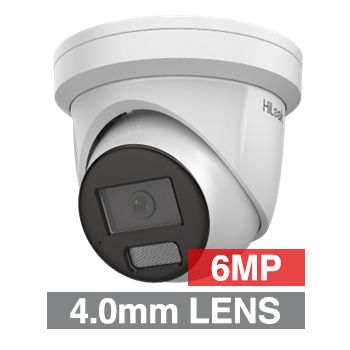 - HILOOK, AIO 6MP HD-IP Outdoor Turret camera with Red & Blue Strobe, 2 Way Audio, White, 4.0mm lens, 30m IR or White light, 120dB WDR, 1/2.4" CMOS, H.265/H.265+, IP67, Tri-axis, MIC, 12V DC/PoE