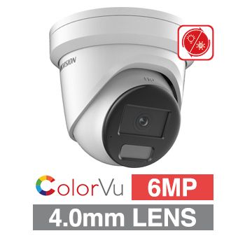 - HIKVISION, 6MP ColorVu Hybrid HD-IP outdoor Turret camera w/ mic, White, 4.0mm fixed lens, 40m IR & White LED, WDR, Microphone, 1/1.8" CMOS, H.265+, IP67, Tri-axis, 12V DC/POE