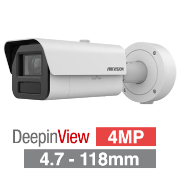 - HIKVISION, 4MP DeepinView HD-IP outdoor ANPR Bullet camera, White, 4.7-118mm motorised zoom lens, 200m IR, WDR, I/O (Alarm & Audio), 1/2.5" CMOS, H.265+, IP67, IK10, 12V DC/POE