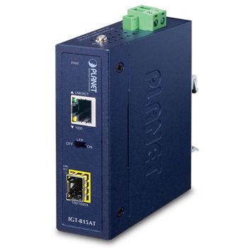 - PLANET, Industrial Fibre converter, Gigabit ethernet to 100/1000 base-X or FX fibre, Single Mode or Multi Mode, SFP connectors, Din mount, -40 to 75 degrees operating temp, 9-48V DC, PSU required.