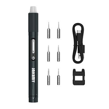 - JAKEMY, Electronic Screwdriver, Lithium battery, Adjustable torque, Reversable, Changeable driver bits, LED light, Rechargable via USB-C, 2 hour battery use.