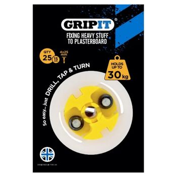 - GRIPIT, 15mm plaster board anchor, Drill/Tap/Turn technology, holds up to 30kg, 25 pack
