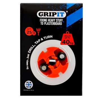 - GRIPIT, 18mm plaster board anchor, Drill/Tap/Turn technology, holds up to 40kg, 25 pack