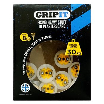 - GRIPIT, 15mm plaster board anchor, Drill/Tap/Turn technology, holds up to 30kg, 8 pack