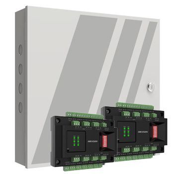 - HIKVISION, 8 Door Network access controller, Browser support, Exp to 128 doors, 8x relays, 32x inputs, 8x alarm outputs, 8x Wiegand inputs, 100,000 users, RS-485, battery backup, 240V.