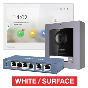 - HIKVISION, IP Intercom Kit, Includes 1 x DS-KH6350-WTE1/WHITE 7" room station, 1 x DS-KD8003-IME1 door station module, 1x DS-KD-ACW1 surface mount backbox/frame & 1x DS-3E1106HP-EI POE switch
