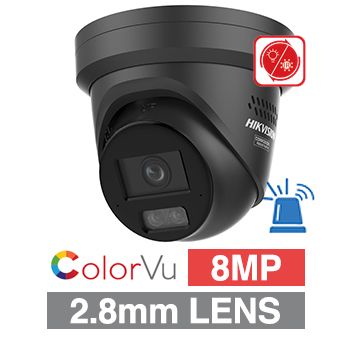 HIKVISION, 8MP ColorVu G3 Hybrid HD-IP outdoor Turret camera w/ mic, Black, 2.8mm fixed lens, 30m IR & White LED, WDR, Microphone & Speaker, 1/1.8" CMOS, H.265+, IP67, Tri-axis, 12V DC/POE