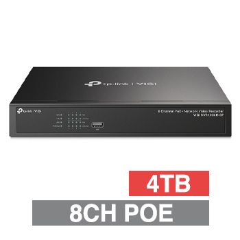 - TP LINK, HD-IP POE+ NVR, 8 channel POE+ (802.3af/at), 80Mbps bandwidth, 1x 4TB SATA HDD (1x 16TB max), 2x USB2.0, 1 Audio In/Out, HDMI/VGA (simultaneous)
