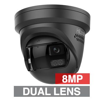 - HILOOK, 8MP AIO HD-IP Outdoor Ultra Wide Dual Lens Turret camera with Red & Blue Strobe, 2 Way Audio, Black, 2mm lens, 30m IR or White light, 120dB WDR, 1/2.4" CMOS, H.265+, IP67, Tri-axis, 12V DC/PoE