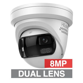 - HILOOK, 8MP AIO HD-IP Outdoor Ultra Wide Dual Lens Turret camera with Red & Blue Strobe, 2 Way Audio, White, 2mm lens, 30m IR or White light, 120dB WDR, 1/2.4" CMOS, H.265+, IP67, Tri-axis, 12V DC/PoE