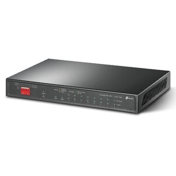 TP LINK, 10 port gigabit switch, Desk mount, Steel case, 10x Gigabit ports (incl 8x POE+), 1 Gigabit & 1x Gigabit combo SFP/RJ45, Fanless, includes 53.5V DC PSU, 123W total budget.