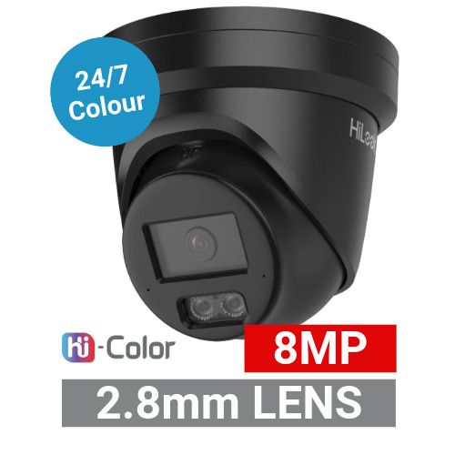 - HILOOK, Pro Series Hi-Color, 8MP Outdoor Turret camera, Metal, Black, 2.8mm fixed lens, 30m White Light, 130dB WDR, Day/Night (ICR), 1/1.8" CMOS, H.265+, IP67, Tri-axis, Microphone, 12V DC/PoE