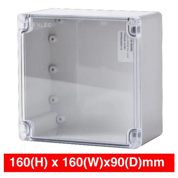 Polycarbonate enclosure with clear cover. 160(H) x 160(W) x 90(D)mm, internal metal plate is ALL-ENL1616DP.