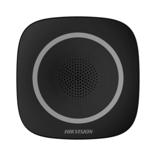 HIKVISION, AX Pro, Wireless Indoor sounder, Black with Blue indicator, 433MHz, Two-way, Configurable arm/disarm, 3 Alarm sounds, 90-110 dB, 12V DC or 3x CR123A (not incl.) powered