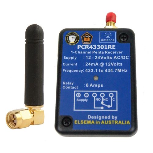 - ELSEMA, Penta Series Receiver, 1 Channel, with Relay output, 433 - 434MHz FM signal, IP66 Case, Suits PentaFOB and PentaCODE transmitters. 12-28V AC or 11-36V DC