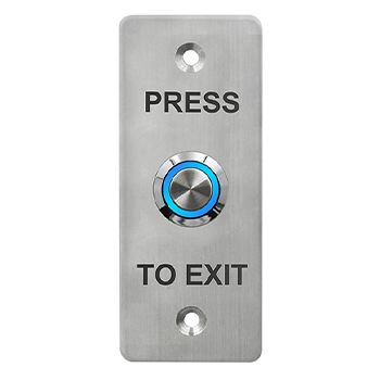 - NETDIGITAL, Switch plate, Wall, Architrave, Stainless steel, Labelled "Press to Exit", With stainless steel Blue illuminated push button, Plate 35mm x 90mm, N/O and N/C contacts