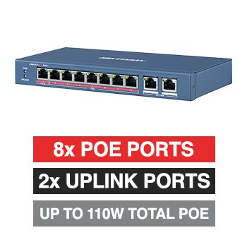 - HIKVISION, 8 Port Ethernet POE network switch, Non-managed, 8x 10/100Mbps PoE ports, 2x 10/100Mbps Uplink port, Max port output 60W power, Total POE power up to 110W, IEEE802.3af/at